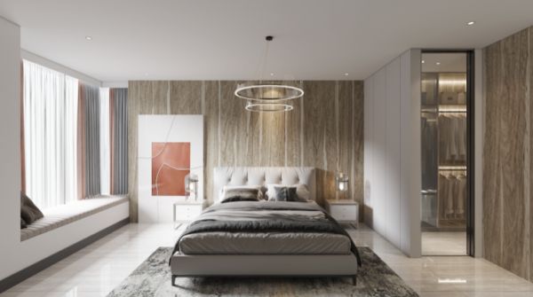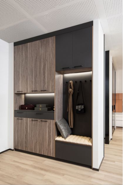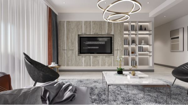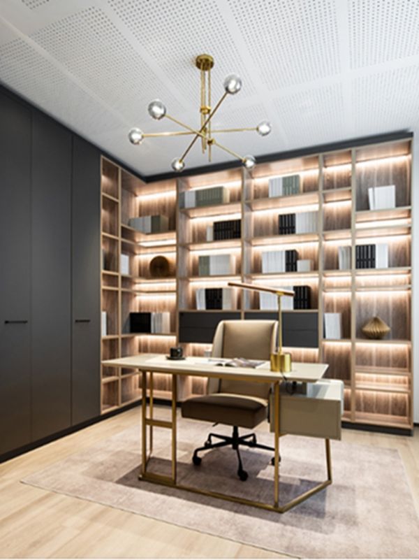 入户是归家人的第一道心灵放松之门。回家的第一分钟开始,卸下一天的疲惫,微笑向暖,安之若素。“冰岛阳光”打造的玄关区就是让人彻底放松的区域。随手将外套放于挂衣区,在开放台放下包包和钥匙,刚脱下的鞋子放于过道大鞋柜,工作和生活的切换自如,令我们保持微笑和乐观。轻客厅,轻生活。客厅空间里仿若悬浮式书厅柜的轻灵,暗影浮动,心中有光。左边收纳柜表面平静却井井有条,右边开放格错落有致却别具一格,归家的人像一只只飞鸟回到森林,轻轻停在家里。书房空间则是丰盈内心的一方天地,神游于书中,心驰在方外,于折叠门书柜感悟通透平淡,于书柜开放架寻觅宁静平和,大千世界跃然纸上。