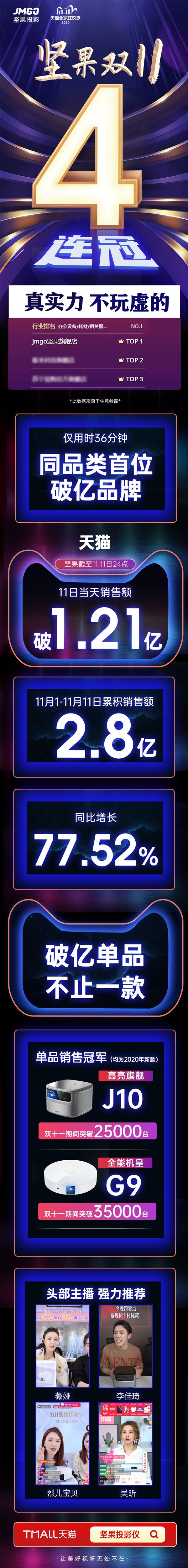 JMGO坚果投影连续四年天猫双十一同品类销售额销量Top 1,凭借极具创新力的高品质产品,坚果投影双十一在天猫单平台实现36分钟销售额破亿的好成绩,最终实现2.8亿的总销售额。除此以外还打造出了两款销售额破亿爆款产品:高亮旗舰坚果J10、全能机皇G9。这是消费者对坚果投影的认可。