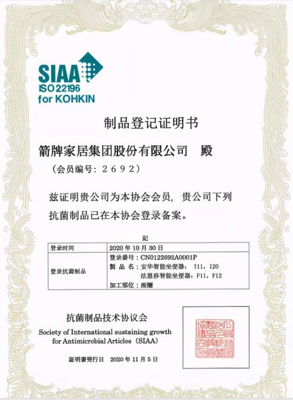 日本SIAA认证标志由抗菌制品技术协议会自1998年起开始使用,代表符合标准规定、可被信赖的产品,在抗菌性、安全性及标注方面都要求颇高,能获得该协会认证的是相当先进水平的抗菌技术的产品。此次箭牌家居集团旗下多个产品获得了该机构认证,也是在获得“水效领跑者”产品认证后,再次获得了国际权威性机构的认可,展现出了箭牌家居集团的创新实力。