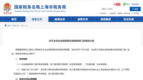 10月30日,全国14个省市自治区陆续发布《关于企业社会保险费交由税务部门征收的公告》(以下简称“公告”),自2020年11月开始实施。企业职工各项社会保险费交由税务部门统一征收。
