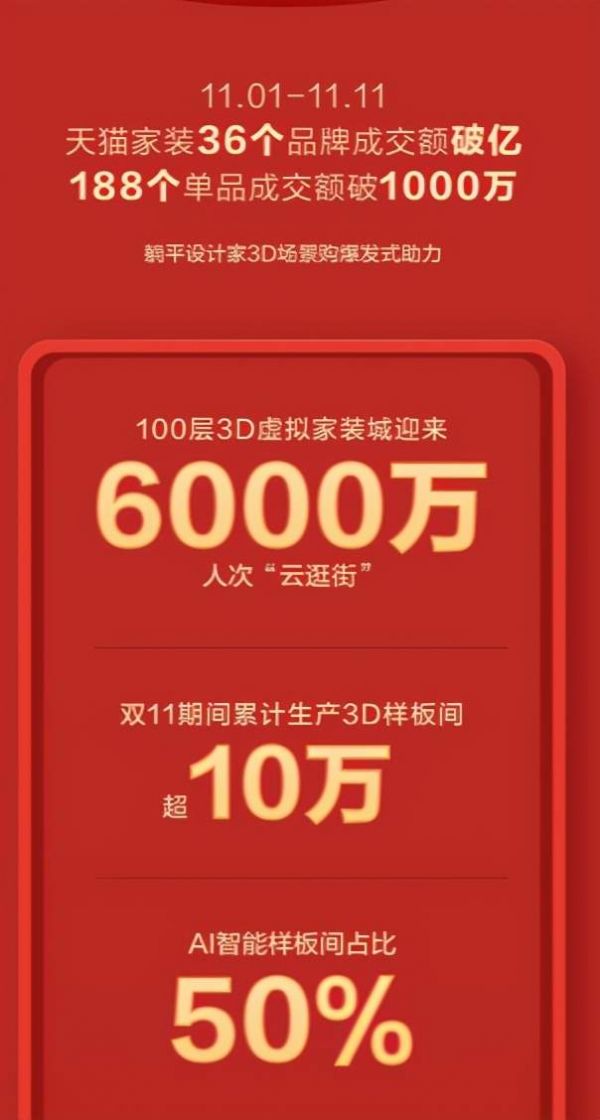 今年的双11,家装家居行业又创下多个消费新纪录。由躺平设计家提供3D技术支持的100层的“天猫3D家装城”迎来6000万人次“云逛街”,相较几个月前的618,家装“云逛街”人数猛增近一倍,3D样板间引导商品成交金额激增4倍。