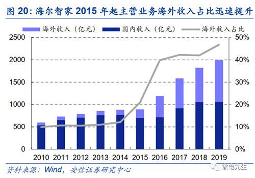目前,海尔智家已形成了全球化品牌布局,2014~2019年,海尔智家的海外收入占比由12.1%提升至46.5%,且均来自自主品牌。安信证券认为海尔智家在海外将进入“收获期”。