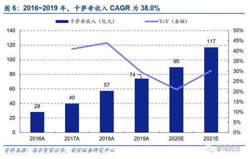 同时,其长期经营的卡萨帝通过产品力和品牌打造,不断扩大在高端市场的影响力。近年来,卡萨帝品牌收入快速增长,在海尔智家矩阵式的组织架构以及智慧家庭生态战略之下,卡萨帝能够较好地发挥品类间地协同效应,逐渐实现在高端家电市场的良性循环。目前,卡萨帝已经成为中国家电行业领先的高端品牌,为海尔智家贡献的利润已经初具规模。