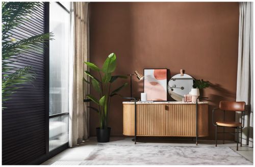 最后提醒大家一下,如果选择Tierra系列的家具,建议使用白橡木地板+地毯,带来生活区的柔和舒适,还可以在木条背景墙上悬挂一个装饰画,就如同整个空间大胆使用的淡粉色调一般,大胆且个性。