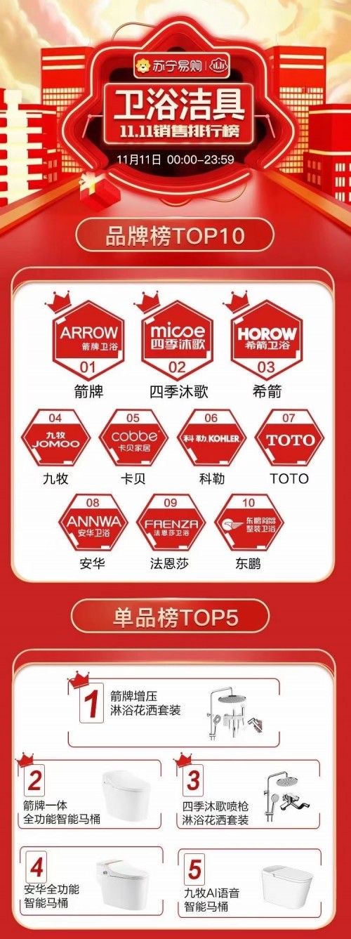 据悉,箭牌卫浴双十一期间全网销售额达7.92亿元,在双十一的第一波活动中,箭牌家居核心官方门店截至11月1日22时销售额整体超去年11月11日全天;第二波活动中,在11月11日开始的19分钟箭牌卫浴全网销售额便突破1亿元,交出第一份成绩单;在11月11日0点到12点的行业榜单上,箭牌卫浴蝉联天猫双11卫浴五金类目榜首;截止11月11日23点59分,箭牌卫浴蝉联苏宁易购卫浴洁具类榜首。另外,活动直播总观看量达1218w,互动量达1030w,短视频曝光量达2974w, 线下1000+家门店参与直播活动。箭牌家居凭借契合中产阶级人群的高品质家居好物与创新体验营销方式,成为用户选购智能家居的首选品牌,展现了中国品牌正在不断提升国民生活品质的价值。