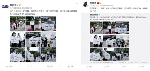 无声胜有声,言辞中透露出因偏见失去位置的辛酸。原来,这是皮阿诺发起的一场宣扬#还我位置#的文明举牌行为艺术,这场文明倡议引发了网友的热议: