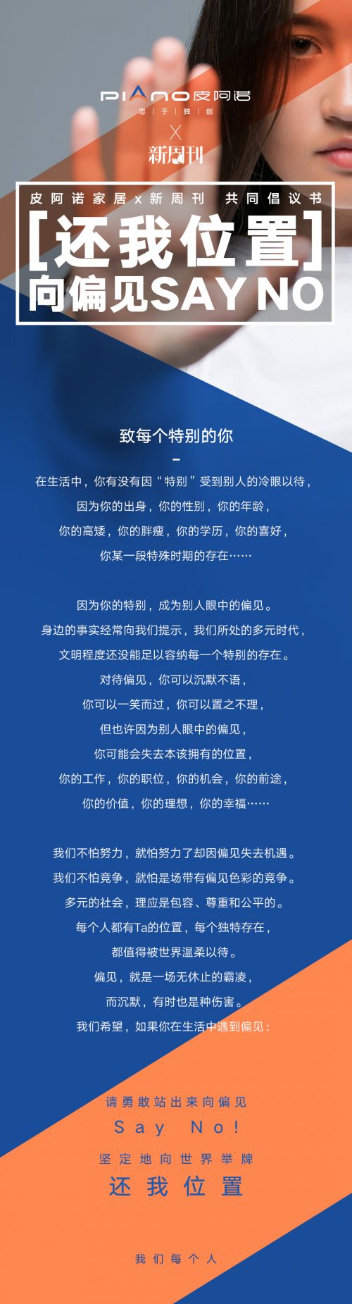 为此,皮阿诺还携手了中国最新锐的生活方式周刊《新周刊》,向社会发起#还我位置 向偏见Say No#文明倡议,希望大众能一起向社会勇敢发声,通过共同的努力,让每个人回到属于自己的位置:
