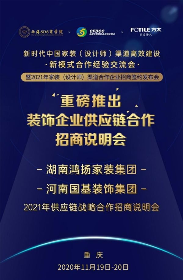 “新时代中国家装(设计师)渠道高效建设新模式合作经验交流会”暨“2021年家装(设计师)渠道合作企业招商签约发布会”期间,中国优秀家装品牌企业鸿扬家装集团,河南省最大的建筑装饰企业国基集团还将在现场举办“2021年度供应链招商说明会”,和与会家居企业具体分享、建立新型供应链产品采购合作,据悉,会上将有国内优秀家装企业与材料领军企业正式签署2021年度产品采购合作协议!