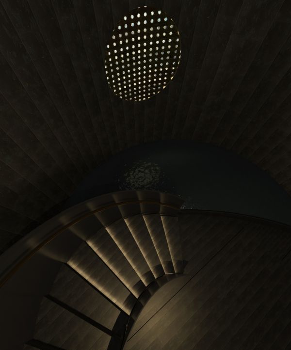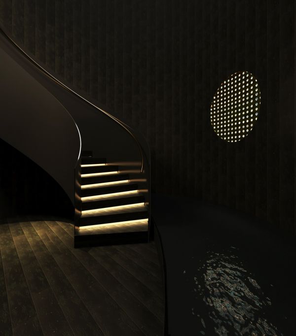 设计作品的灵感的来源于一次雨后清晨的山间漫步。晨光透过树木洒出光线,斑驳的光影投射在路面上,路边的植物上还沾着雨露,在晨光的照射下晶莹剔透。这种来自自然的感受直达内心,所以就想呈现关于树木,雨露、晨光的灵感。通过显性和隐性的两种材质的对比来去做空间形式上的表达。墙面上的形状模拟月球,随着地球的时间的推移呈现不同的效果,水晶通过它会有点阵光的效果。在这个场景中,地板上会有细闪的斑点,类似在宇宙中看到的繁星,整体呈现了众星捧月的效果。