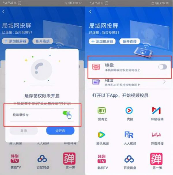 2.安装好后进入乐播投屏首页面,选择所需要投屏的设备连接,这时界面会弹出悬浮窗权限未开启提示,记得打开显示悬浮窗,成功连接后在手机上打开镜像按钮,即可实现投屏.