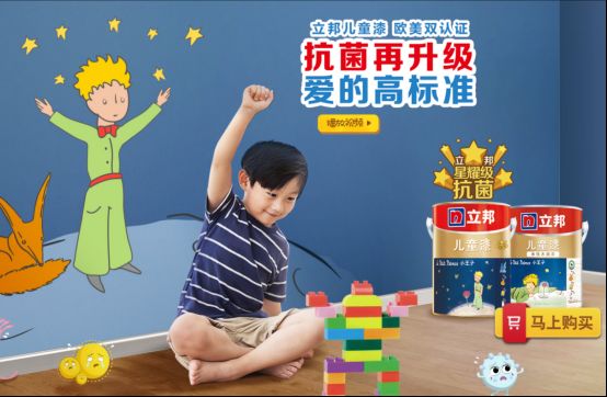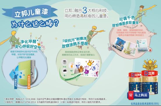 立邦儿童漆,融合立邦3大核心科技:分解甲醛、I级抗污、可调千色。首先,立邦儿童漆不仅自身无添加,更能有效分解室内空气中的游离甲醛,从而有效降低室内空气中的甲醛含量,甲醛净化性能优于行业标准,让父母更安心。其次,立邦儿童漆耐污渍性优于《内墙耐污渍乳胶涂料》(I级)标准,是目前国内最高的抗污标准。立邦儿童漆还拥有可调千色技术,可依据孩子的不同性格个性化定制颜色,培养出孩子丰富的想象力和创造力,给儿童带来更逼真的缤纷色彩体验。