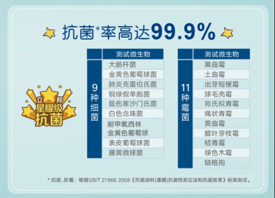 不仅如此,立邦儿童漆还通过了严苛的欧美双认证(德国莱茵TÜV认证、美国绿色卫士GREENGUARD金级认证),同时抗菌标准也再次升级,可抵御9种细菌和11种霉菌,抗菌率高达99.9%。