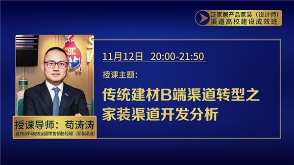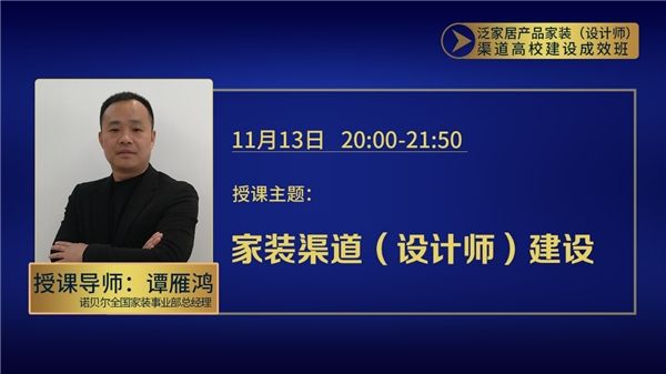 “泛家居产品家装(设计师)渠道高效建设成效班”线上课程全面剖析了家装(设计师)渠道具体、有效、准确的突破和打造路径以及具体落地的方式方法。近日,泛家居线上课程最后两课上线,由宣伟涂料高级全国零售销售经理(家装渠道)苟涛涛、诺贝尔全国家装事业部总经理谭雁鸿带来家装渠道建设思路分享。
