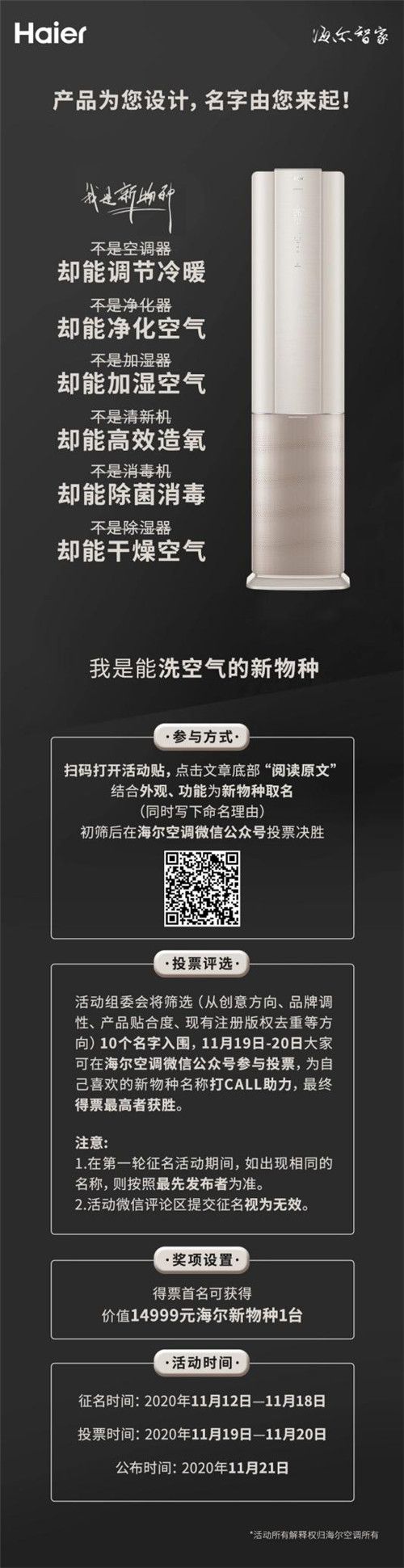 网友可在海尔空调微信公众号提交创意,征名提报截止时间为11月18日。活动组委会将筛选10个名字入围,11月19日-20日,网友们可在海尔空调微信公众号参与投票,为自己喜欢的新物种名称打call助力!