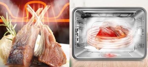烤制模式下,箱体采用了立体热风循环烤,在顶部、左面和底面配有加热管,左侧大直径风扇配合辅助加热,达到均温同烤的效果,还会适度给食材补给蒸汽,烤出来的食材鲜嫩多汁。在120℃快速蒸模式下,强力热气可穿透食材内部,即使是蹄膀大骨也能轻松蒸透。