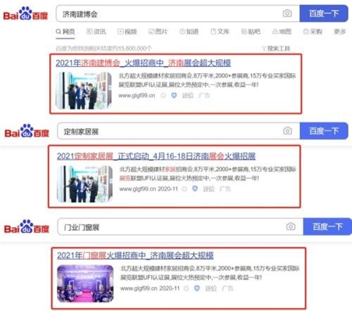 2021济南建博会已全面投放百度搜索广告、朋友圈广告、抖音广告,加强展会曝光力度,通过特定关键词的展现,不断扩大展会信息的宣传范围和宣传力度,迎合专业买家的搜索习惯,在最大程度展现展会信息的同时,确保广告投放精准度,并在广告页对已参展企业进行宣传推广,助力企业品牌曝光!