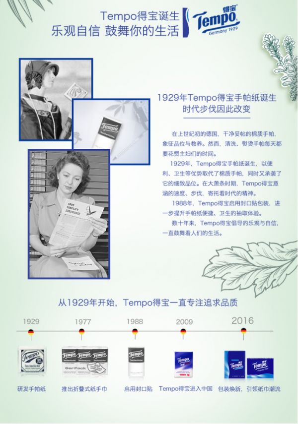 “Tempo”在德国就是纸巾的代名词,Tempo在德语中表示速度和步伐,寓意一切都有可能。1929年, Tempo得宝推出了世界上第一款手帕纸,以替代棉质手帕的便利性和高品质迅速成为德国乃至欧洲大受欢迎的品牌。2009年,Tempo正式进入中国内地市场,开始在中国市场的发展之路。通过沉淀近百年的品牌思考,Tempo得宝在中国市场上的发展一方面不断强化品牌设计内涵,更加注重消费者的个性需求,将时尚元素融入新开发的产品中;另一方面,从整体产品架构出发,不断迭代更新。积极探索生活用纸可持续发展的突破口。
