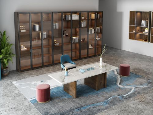铂晶系列茶桌,轻奢格调设计,柜体选用纹理清秀、色泽淡雅的天之宝胡桃木,给人温暖、平和的感觉;台面选用纹路通透、精致简约茶色大理石,呈现时尚、优雅的格调。桌腿粗细对比的设计不乏点睛之效,突破传统大板茶桌设计,显得稳重又摩登,为整个空间增添了几分灵动。