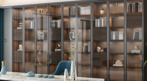铂晶系列书柜,柜门设计为智能按压式,无需手拉,轻触柜门即按即开,方便取物;门把选用液压阻尼门铰链,品质五金,美观时尚;柜门之间选用细砂暮色灰铝制隔板,精益求精,大气有质感;可谓材美工巧,整体承重能力强,不易变形,稳重牢固。
