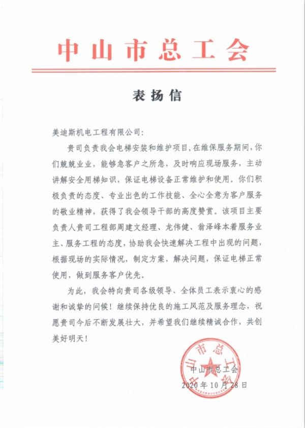 电梯的安全运行,离不开电梯维保人员日常的努力。近日,美迪斯工程服务部收到了中山市总工会发来的表扬信:“在维保服务期间,兢兢业业,能够急客户所急,及时响应现场服务,积极负责的态度、专业出色的工作技能、全心全意为客户服务的敬业精神,获得了我会(中山市总工会)领导干部的高度赞赏。”