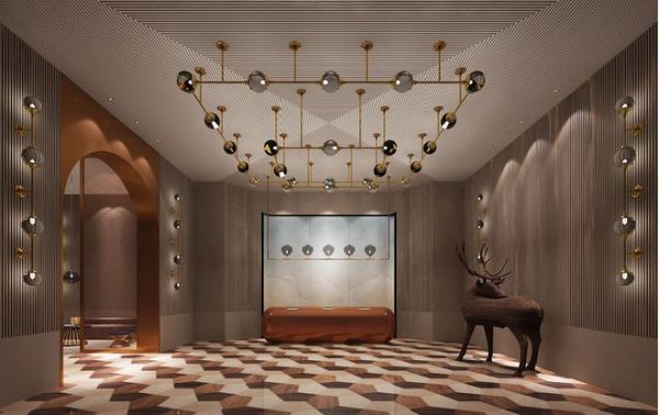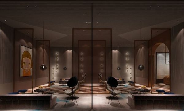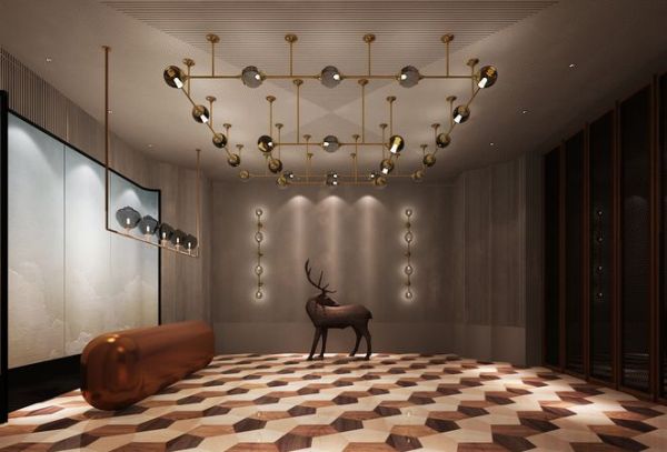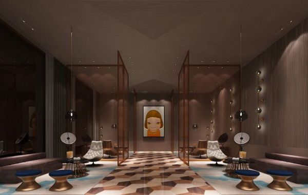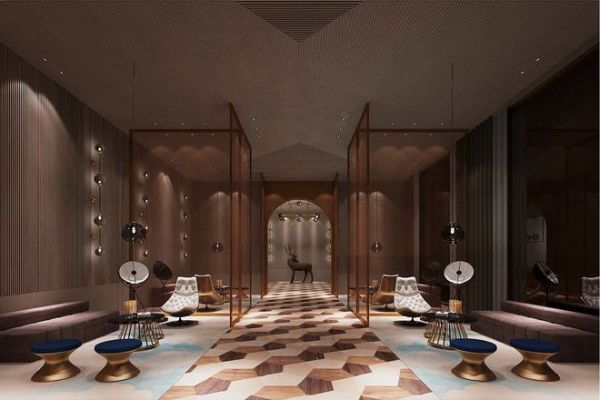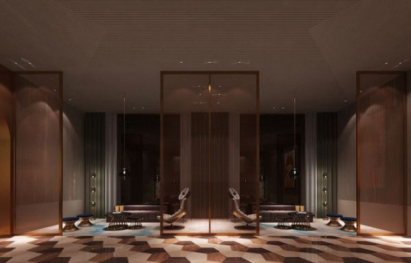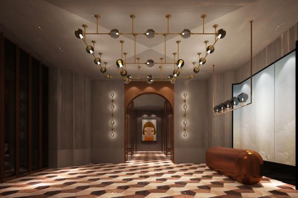 “蛾儿雪柳黄金缕,笑语盈盈暗香去。众里寻他千百度,蓦然回首,那人却在,灯火阑珊处”。本案为一酒店的大堂区域;以辛弃疾的诗词为由头,既表达了酒店身处闹市灯火辉煌的喧嚣气氛,错落有致的金属丝网与光影也体现了灯火阑珊处的影影绰绰。点线结合网格空间为主导,木头元素的天然淳朴和铜元素的时尚相碰撞,整体空间简洁高雅,地面的彩拼地板丰富了视觉感受,空间纯粹而空灵!木材搭配时尚的金属等元素,朴素中更显气质;铜质与木材的对比显现了酒店的“大隐隐于市”的气质;造型上细腻的线条给予感官上更加舒适,进一步衬托出空间的卓尔不凡!