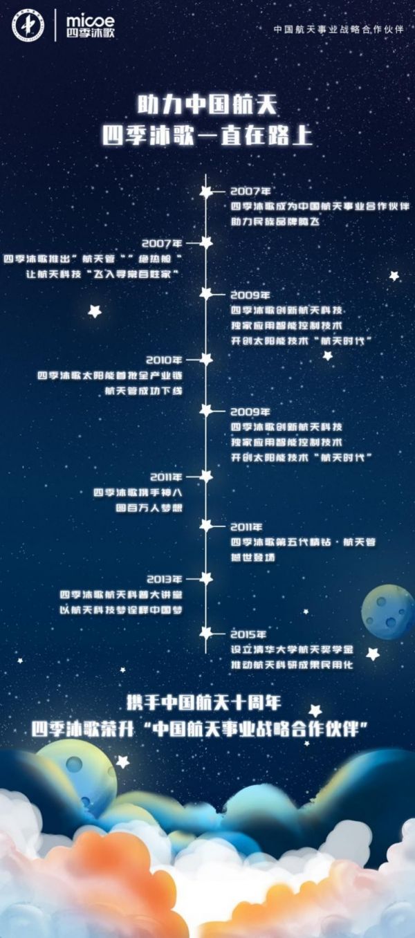 其实,作为“中国航天事业战略合作伙伴”的四季沐歌对于国家航天精神的传播与弘扬由来已久。早在2007年,四季沐歌就组织优秀经销商代表亲临位于西昌的卫星发射中心,观看我国的第100次火箭发射;2011年11月,神舟八号升空,并与天宫一号成功对接。随神舟八号共飞天的还有四季沐歌从“携手神八 · 交会梦想”大型公众征集活动征集到的百万人梦想卡、四季沐歌旗帜、四季沐歌全自动芯片、航天镀膜片、绿色无氟发泡料等物品,他们共同记载和见证了我国航天事业的发展历程,也成为载人航天文化的重要组成部分;2015年6月8日,清华大学航天航空学院“四季沐歌航天奖学金”正式启动,是中国新能源光热领域在全国高校设立的重要奖学金。四季沐歌不仅拉近了大众与国家航天事业的距离,更让人们真切感受到了航天精神对于我国当前发展的意义以及强大的推动力。