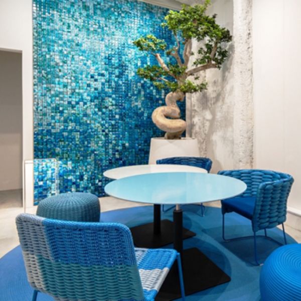 地面上,Zoe 地毯让人联想到用碎石和沙子铺就的精细图案,在枯山水中往往让人想到海浪的和谐感。在空间的底部,蓝色的 Sciara 装饰再现了平静而持续的水流。