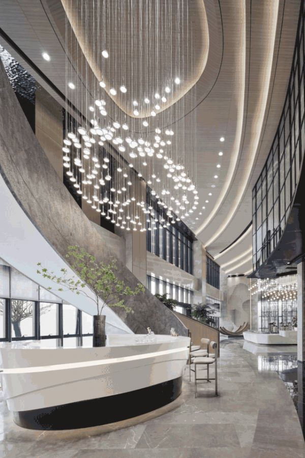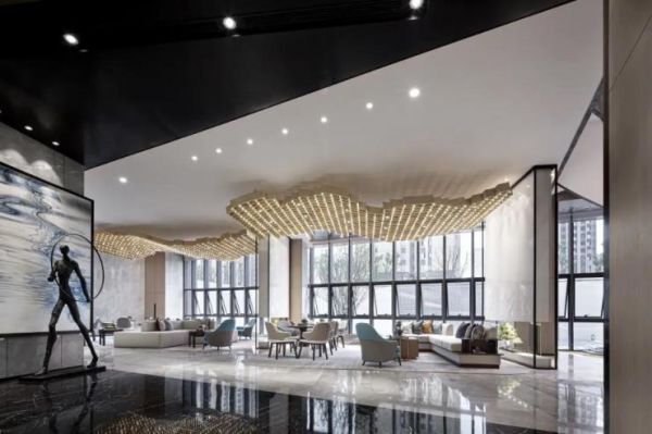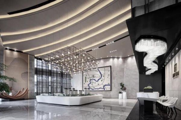 洽谈区如波光点点吊灯,极具现代感的造型与层次,与墙体格栅水晶块相映成趣,让空间的韵致无限延伸。远处若隐若现的佳山正水,浮云缥缈,江穿高楼,在满足艺术感需求的同时,赋予了空间一种无限开阔的视觉效果。