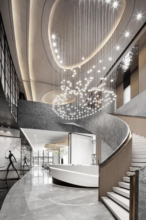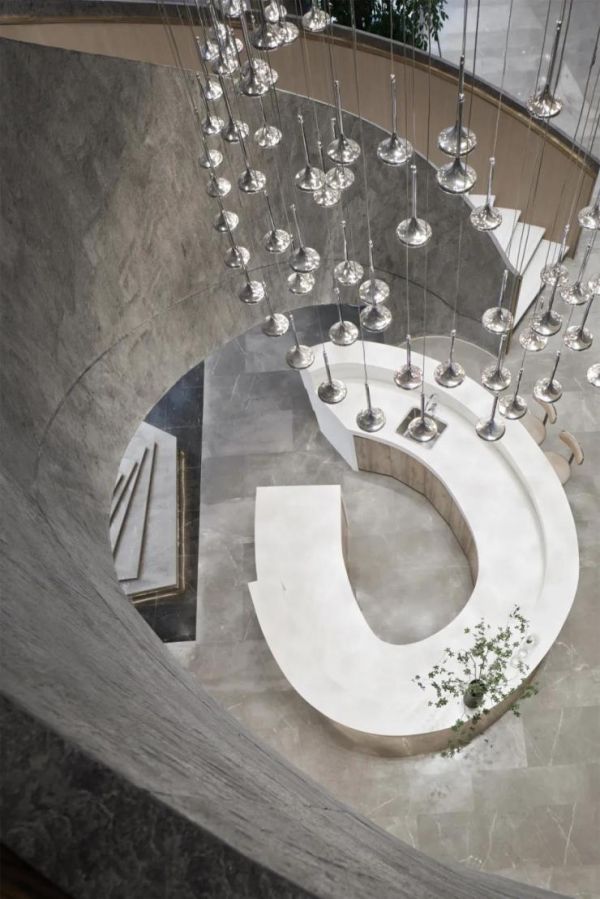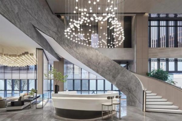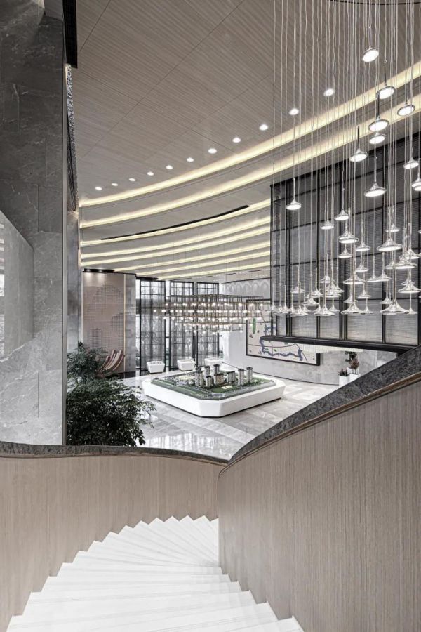 一气呵成的整体扶手设计,为简洁、自然的氛围奠定了基调。流畅的线条与自然的曲线承载着空间的流动性和开放性,营造出庄严且高级的氛围,为到达二楼签约区的豁然开朗埋下伏笔。