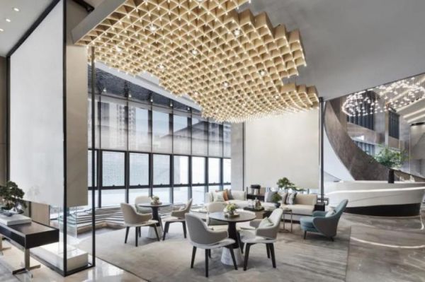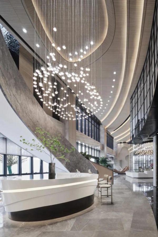 接待大堂流线形的顶部设计,和强烈造型感的空间结构,极具视觉冲击力。流线形态的艺术装置打造一叶扁舟,映射出重庆这座城市的文化底蕴。