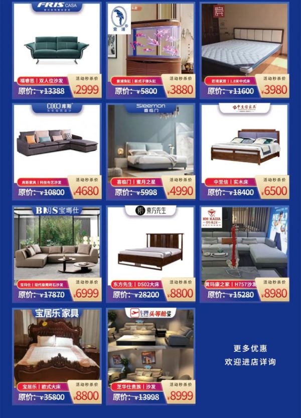 万家丽家具购物节活动期间,各大品牌推出劲爆秒杀单品最低9.9元起!超值抢购大牌下定满2000元,活动当天还能参与全场百分百返现。秒杀单品数量有限,心动不如行动,考验大家手速的时候到了!