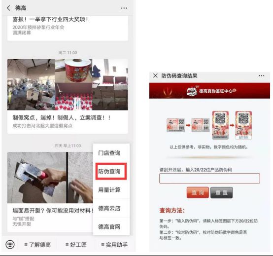 1、微信关注“德高”官方公众号→点击右侧菜单栏→实用助手→防伪查询→选择对应标签→输入防伪码即可查询;
