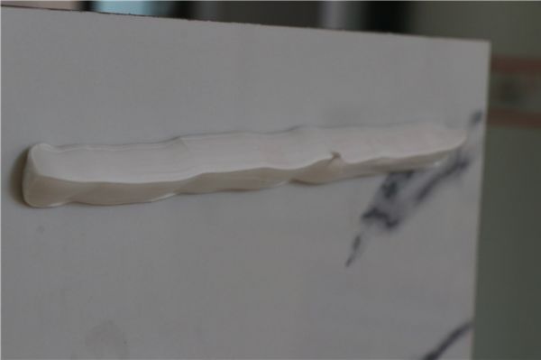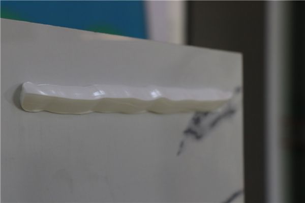 在评测中,来自西卡德高的技术工程师在墙上打了胶,我们两个小时之后再观察胶的里面,胶的棱角基本没有出现下垂或流挂的现象。