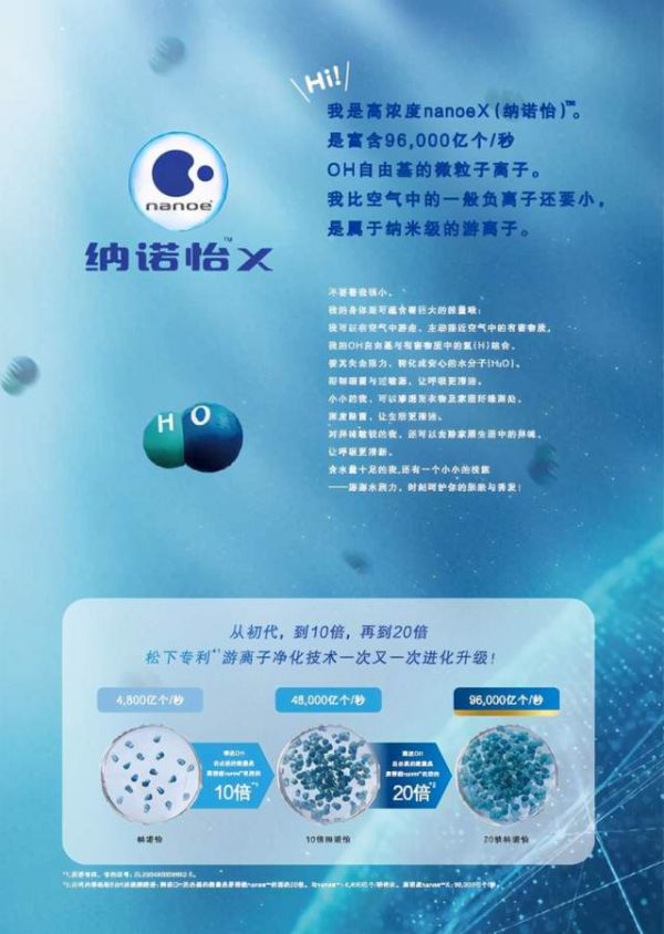 提到松下空调,不得不提松下专利nanoe游离子净化技术。释放出的OH自由基可与有害物质中的氢(H)结合,使其失去活力,转化成令人安心的水分子。2016年,松下研发出的nanoeX,相比于初代nanoe,OH自由基含量提升了10倍,而如今主打的“高浓度nanoeX”的OH自由基含量则比初代nanoe提升了20倍。也就是说,每秒的含量也从4800亿个,提升到48000亿个,到如今的96000亿个,净化效果大幅提升。高浓度nanoeX具备抑制过敏源、净化除臭、分解PM2.5中的有害物质、滋润头发和肌肤等七大功能。更重要的是,作为家庭专属“空气管家”的高浓度nanoeX,还可以有效杀灭手足口病毒(CA16&EV71)和疱疹病毒,守护每一位家庭成员的健康。