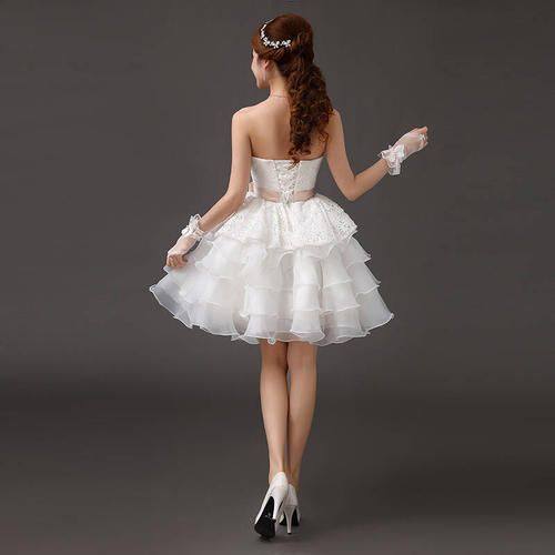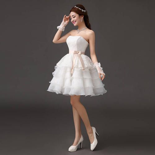 前短后长婚纱近年比较流行,对于个子矮的新娘也非常适合,前面的短款设计能将腿露出来,而短拖尾的背部带有优雅浪漫的感觉。