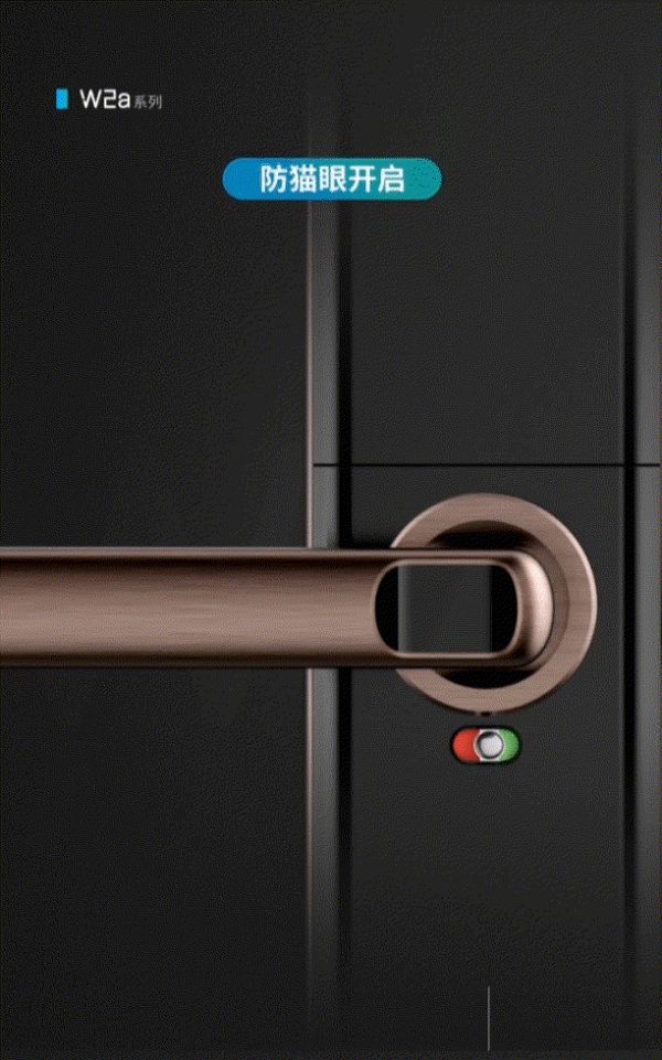 一键防猫眼开启也是顶固智能锁的必备安全功能,打开后内执手锁止,有效防止孩童随意下压把手出门,更能有效防止小偷通过猫眼孔压内执手打开门锁入室偷窃,保障家人和财产安全。