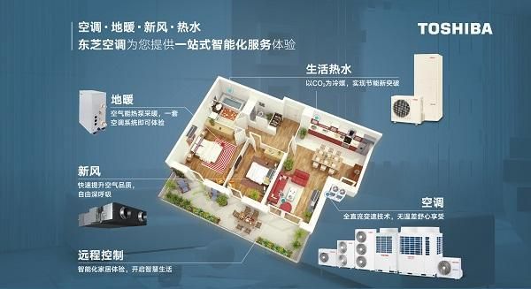 东芝空调推出的"冷暖风水"一站式服务。产品包括全变频直流无刷空调、热泵采暖系统、新风系统及自然冷媒[CO2]热泵热水机,一站式为用户消除产品方案顾虑,简化安装沟通环节,解决售后服务问题。