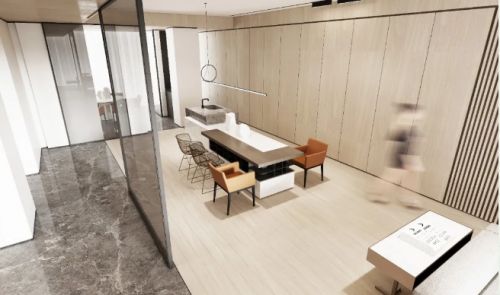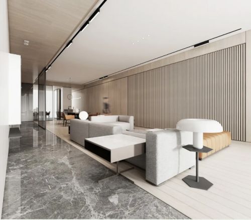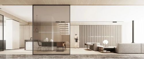 造型上采用轻巧简洁的线条勾勒,创造出自由而精致的美感;不同材料的肌理和色彩交接,诉说高雅品位的生活方式;透明的玻璃隔断则氤氲出虚实相生的氛围,映照出细节的艺术和时光的印记。