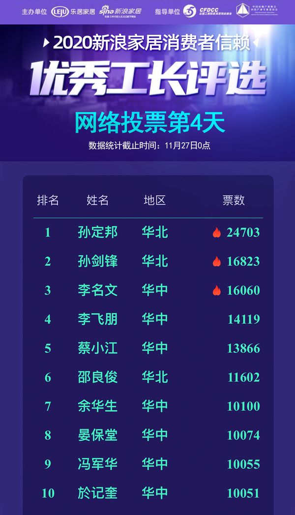 累计有效票数超26万 孙定邦蝉联榜首 | 消费者信赖优秀工长票选Day4