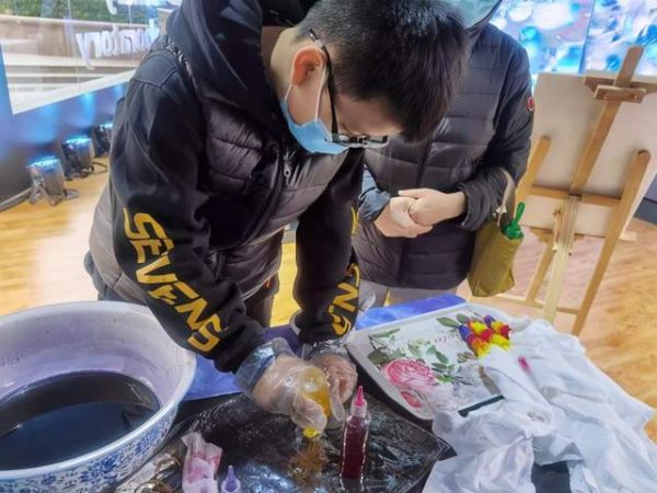 扎染是汉族民间传统而独特的染色工艺,是织物在染色时部分结扎起来使之不能着色的一种染色方法。扎染的神奇效果,吸引观众在扎染焕新区亲自体验扎染工艺,感受布料与染料之间的特殊“羁绊”。