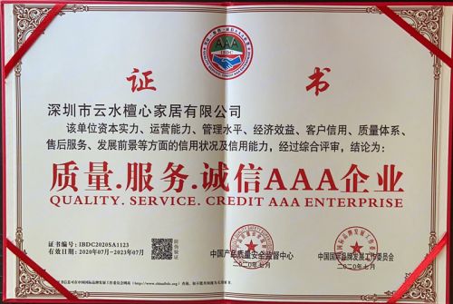 近日,深圳市云水檀心家居有限公司及旗下“云邸”家居品牌,经过一系列严格的审查及复核评审,凭借强大的品牌实力与健康环保的产品,顺利通过“质量.服务.诚信AAA级企业”、“中国家具行业畅销品牌”、“中国绿色环保产品”等三项证书,这标志着深圳市云水檀心家居有限公司在企业及品牌经营管理方面取得卓越成果,再度赢得了行业与机构的充分肯定!用实力证明品牌力量!