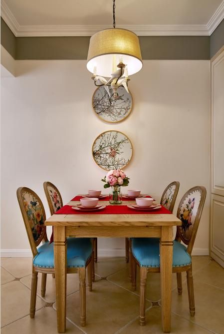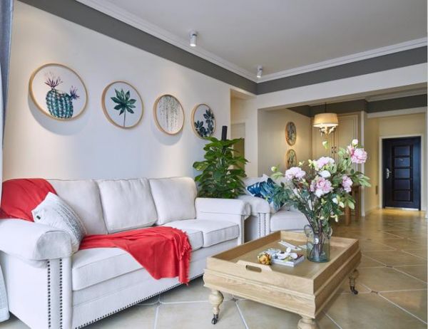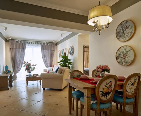 从客厅来看,属于开门直接看到底的视野,非常"正气"十足,复古又典雅的家居陈设,为空间增添了几分浪漫的气息。简美式元素的家具与优雅低调的布艺窗帘相呼应,构筑了浓浓的复古风情,配以阳台采集的充足阳光,最大化延伸入户视线。画饰摆件以轻松姿态,绽放优雅。客厅和餐厅均点缀以热烈盛放的鲜花,家的气息也汇聚于此。