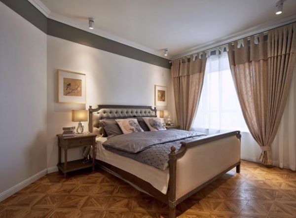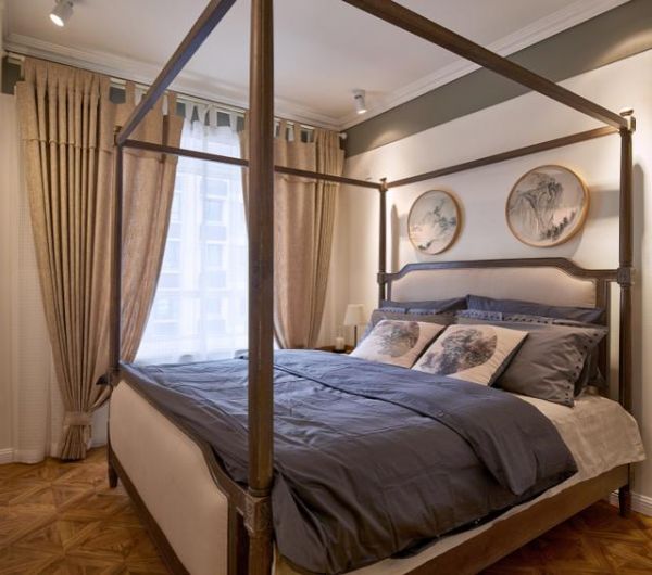 卧室延续了简美小田园风格,利用深色分割的墙顶,拔高视觉,增添新意。配以简单的石膏线条,丰富了美国加州的自由感。实木色系配合浅色粗布艺的家具,舒适又打破了沉闷。为了追求仪式感,主卧选择了传统美式的四柱架床,以凸显主人尊贵的身份。在房间的配饰上,恰到好处地点缀以中式画框,中西元素的相辅相成,使得异国风情更接地气。