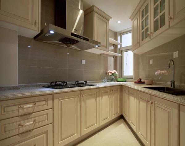 按照工作三角的厨房动线,洗涤区在V形的一边,操作区和烹饪区依次在V形的另一边,防止溅洒和拥挤。垂直空间上,采用高柜、吊柜相结合的方式,满足了屋主的收纳需求,便于收纳咖啡机、面包机等小厨电。