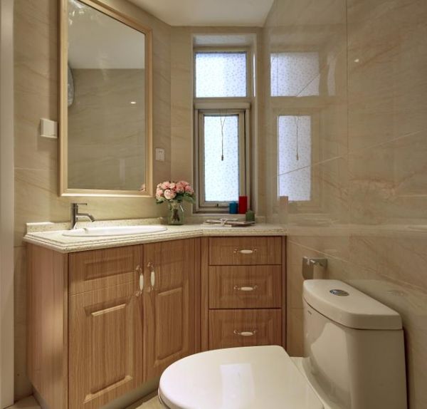 卫生间的梯形墙角定制了与墙面无缝贴合的浴室柜,设置在马桶的旁边,搭配以特殊的五金件,方便物品的储存和收纳。