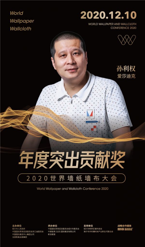 12月10日,2020世界墙纸墙布大会于浙江绍兴圆满落幕。此次大会以“共命运·共行动·共发展——携手共建行业命运共同体”为主题,爱莎迪克董事长孙利权受邀出席,与国内外众多行业精英人士,专家,学者共聚一堂,就新环境下墙纸墙布行业的未来发展趋势开展热烈的交流,共同推进墙纸墙布行业的高速发展。大会现场,“年度突出贡献奖”同时重磅揭晓,此奖旨在选出引领行业发展并为推动行业发展作出巨大贡献的杰出品牌。凭借优秀的领导力,卓越的贡献,爱莎迪克董事长孙利权荣膺“年度突出贡献奖”。