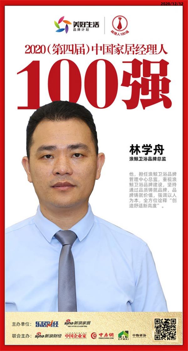 2020年12月12日,“行稳致远——2020(第四届)中国地产新时代盛典暨对话中国家居·2020变局与展望创新峰会”在上海国家会展中心举行。盛典现场,“2020(第四届)中国家居品牌经理人评选”结果揭晓,浪鲸卫浴品牌总监林学舟荣获“2020中国家居品牌经理人100强”。