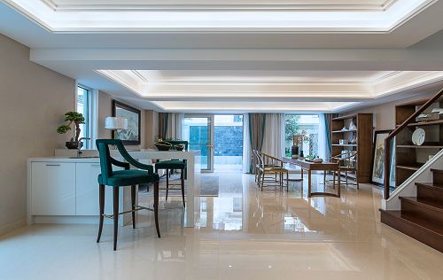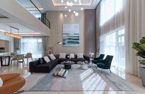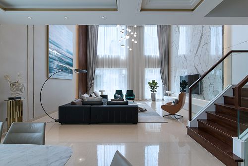 一层通过客厅中空与二层连接起来,让原本独立的二层书吧、客厅相互映衬。客厅透过大落地窗与负一下沉庭院互动起来,让整个空间有起有落,跌宕起伏。