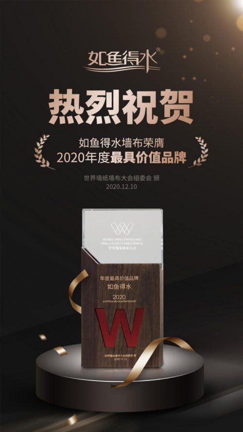 “共命运·共行动·共发展——携手共建行业命运共同体"2020世界墙纸墙布大会于2020年12月10日在浙江绍兴柯桥鉴湖大酒店隆重举办。本次墙纸墙布大会旨在聚集全国各地顶尖软装企业,提供展示产品、交流经验、洽谈合作的机会。本届大会特邀国内外行业协会、行业头部品牌及领军人物大咖设计、经济学者、顶流媒体等汇聚一堂,共同应对市场格局新变化,促进行业新发展。作为窗帘行业的翘楚,如鱼得水应邀出席本次大会,并荣获“2020年度最具价值品牌”奖。墙布事业部负责人范强上台领奖杯。这已是如鱼得水第二次在世界墙纸墙布大会上获奖。2019年如鱼得水荣获了“最具影响力品牌奖”。