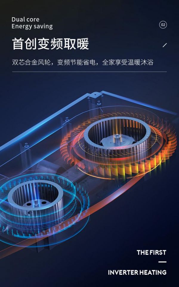 什么是变频技术?就是将风速与PTC加热体进行功率互通调节,智能感应室内温度,高效节能省电,保证室内温暖沐浴环境。
